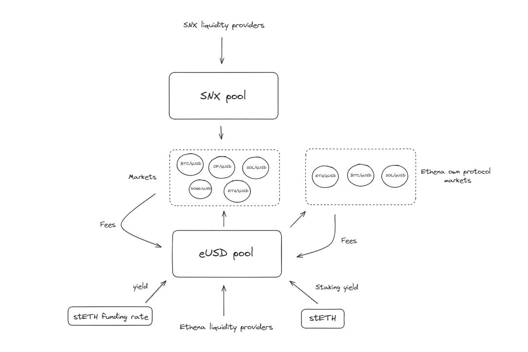 The integration of Ethena is also beneficial to Synthetix. The introduction of permissionless pools will potentially allow for new collateral forms like ETH, stETH and even Ethena’s USDe. Ethena is not only a good source of trading volume for Synthetix Perps but if governance decides to include USDe as an acceptable collateral, it opens up more possibilities for users and also more revenue sources for SNX holders. The end result could look something like the diagram below