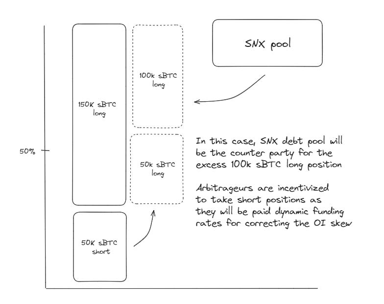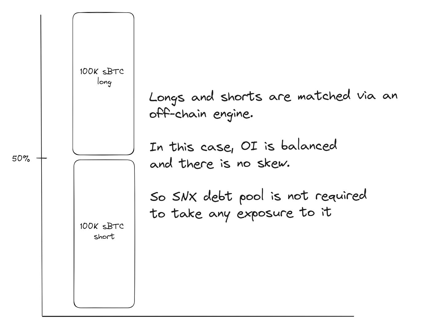 How does this result in better risk management for SNX stakers? The following diagrams show why a balanced open interest is ideal and how perps v2 can help to correct the imbalance skew.