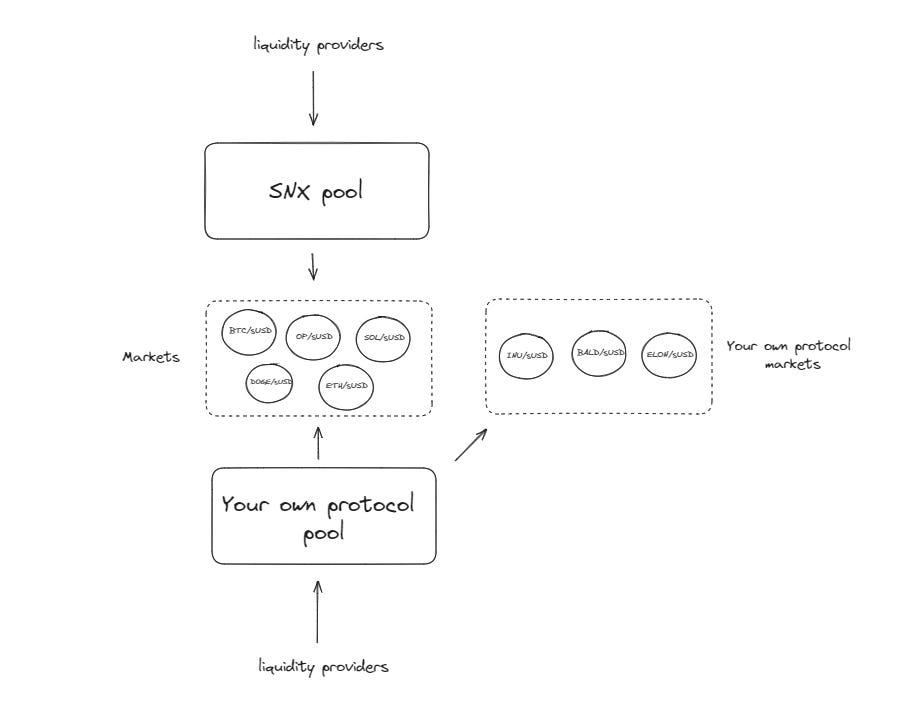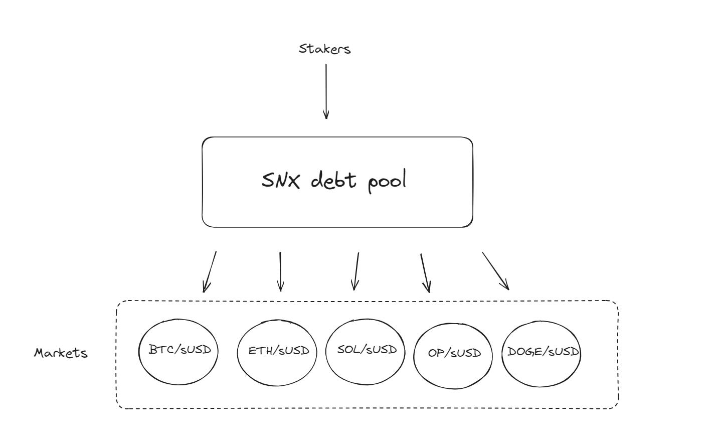 In essence, differentiated debt pools have two main benefits - risk segregation and customized risk exposure. In Synthetix V2, there was a sole SNX debt pool which supported multiple markets. For instance, SNX stakers and the debt pool has exposure to Kwenta’s various trading pairs as seen below. To recap how Synthetix works in simple terms - if the pool takes on counterparty risk, traders losses = profit for SNX stakers, traders profits = losses for SNX stakers. Hence, the exposure to so many different markets with varying volatility is actually a substantial risk for the debt pool. The system relies on efficient arbitrage, volatility needs to remain smooth enough that arbitrage happens efficiently as traders enter, exit or get liquidated. In an event of black swan level of volatility, the SNX pool might be exposed to a significant amount of counterparty risk.